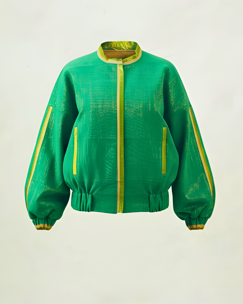 This jacket features a relaxed, voluminous fit with elasticated cuffs and hem, creating a subtly sculpted shape that flatters all body types. The metallic gold woven detailing catches the light with every move, while the zip-up front adds a practical, sporty touch. Perfect for transitioning between seasons, it effortlessly combines cultural heritage with a forward-thinking fashion sensibility.